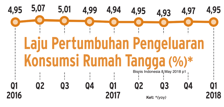 Indonesian Gross Domestic Product (GDP) growth in Q1 2018, did not came as expected. A 5,06% growth in first quarter was away from government 5,4% full year 2018 target growth. Consumption growth, the biggest component in GDP, was slightly lower if compare with Q4 2017 (4.95% vs 4,97%) but just 0,01% above Q1 2017 growth.