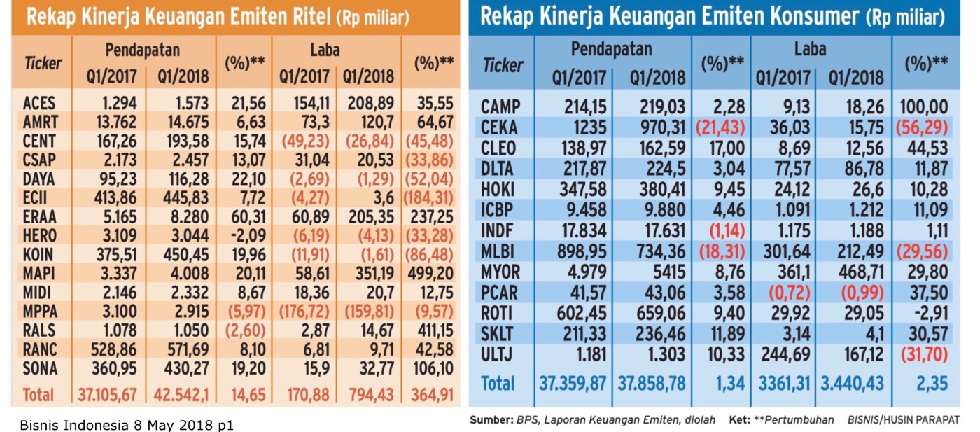 The consumption growth in GDP represent aggregate expenditure of house hold and private sector. Though the retailer and consumer good sector only serve a small part of Indonesian people, the growth of retailer revenue could be seen as one of improvement on spending appetite. If the retailer revenue growth keep increasing in coming financial report and companies revenue in consumer sector has picked up, the consumption in GDP figure may show an improvement.