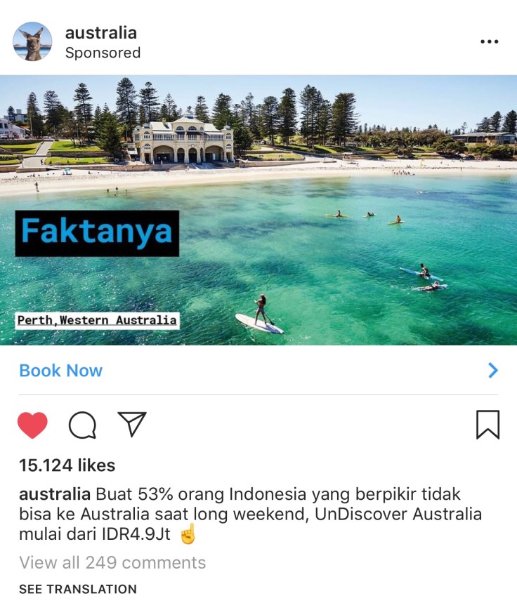 I saw this ads in instagram. The ads has specific target market which is Indonesian people who love to have short getaway while long weekend. I believe with the survey that most of Indonesian will not choose Australia as destination idea when planning for long weekend due to its distance and traveling time. Domestic destination or some ASEAN neighborhood countries might be the first choice to visit during long-weekend.
